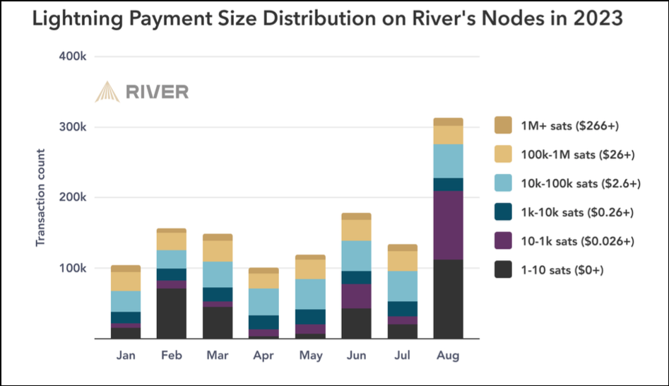 In any case, we have metrics on the Lightning Network that strongly suggest that adoption (1200% annual growth in the number of transactions) and the use case for micropayments (high percentage of transactions below one dollar) are going the right way, as you can see in these graphics from a report published by River on October 2023.